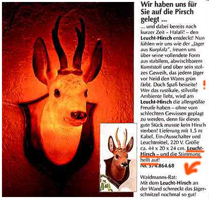 Dies sind die Perlen unter unseren Katalog-Fundstücken. Lassen Sie sich begeistern von Leuchthirschen, Nasenhaarschneidern und Zweitfrisuren (mit abknöpfbarem Nackenteil).